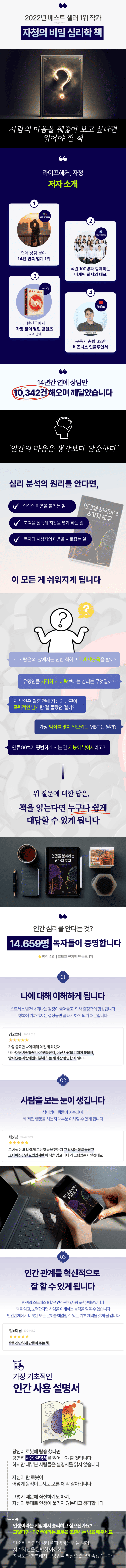 표면적으로는 타인의 심리를 읽는 법을 다루는 듯 보이지만, 결국은 “나 자신을 이해하는 법”에 초점을 맞춘다. 저자는 인간의 행동이 단순한 우연이 아니라 호르몬, 성향, 방어기제 ...더보기