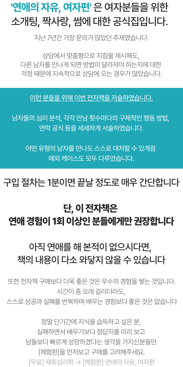 이미 많은 경험으로 자신만의 노하우가 있는 분들이나 아직 경험이 너무 없는 분들에게는 별로 추천하지 않는다. 대신 최근 안 풀리는 연애 때문에 고민이거나, 몇 번의 연애를 겪으면서 길을 헤매고 있는 분들에게는 정말 도움될 것 같다.