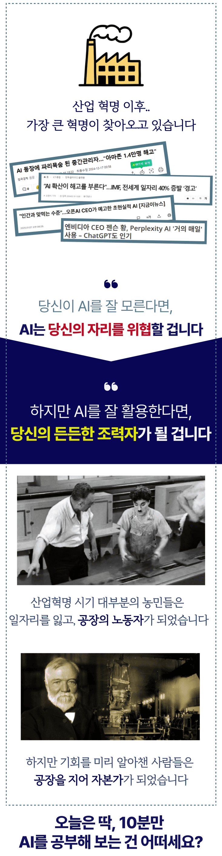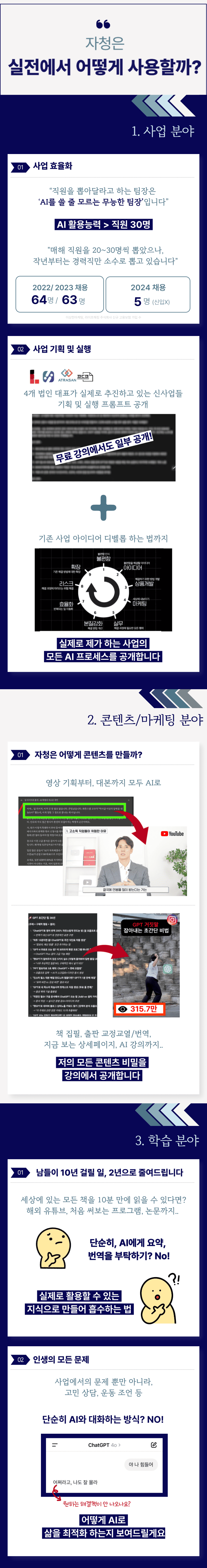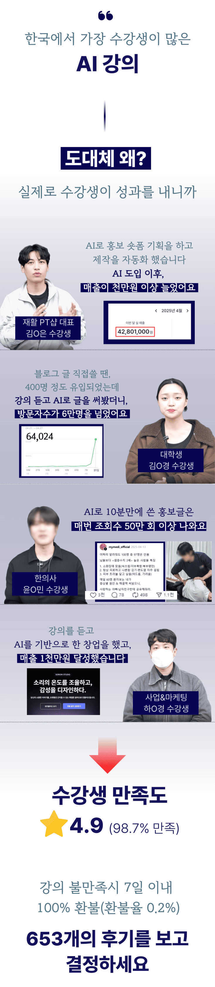 AI는 그냥 쓰면 되지 뭐 강의 듣는 게 필요한가? 생각했는데 아닙니다. 어떤 분야든 AI를 더 잘 활용하면 인생이 업그레이드 될 수 있습니다.