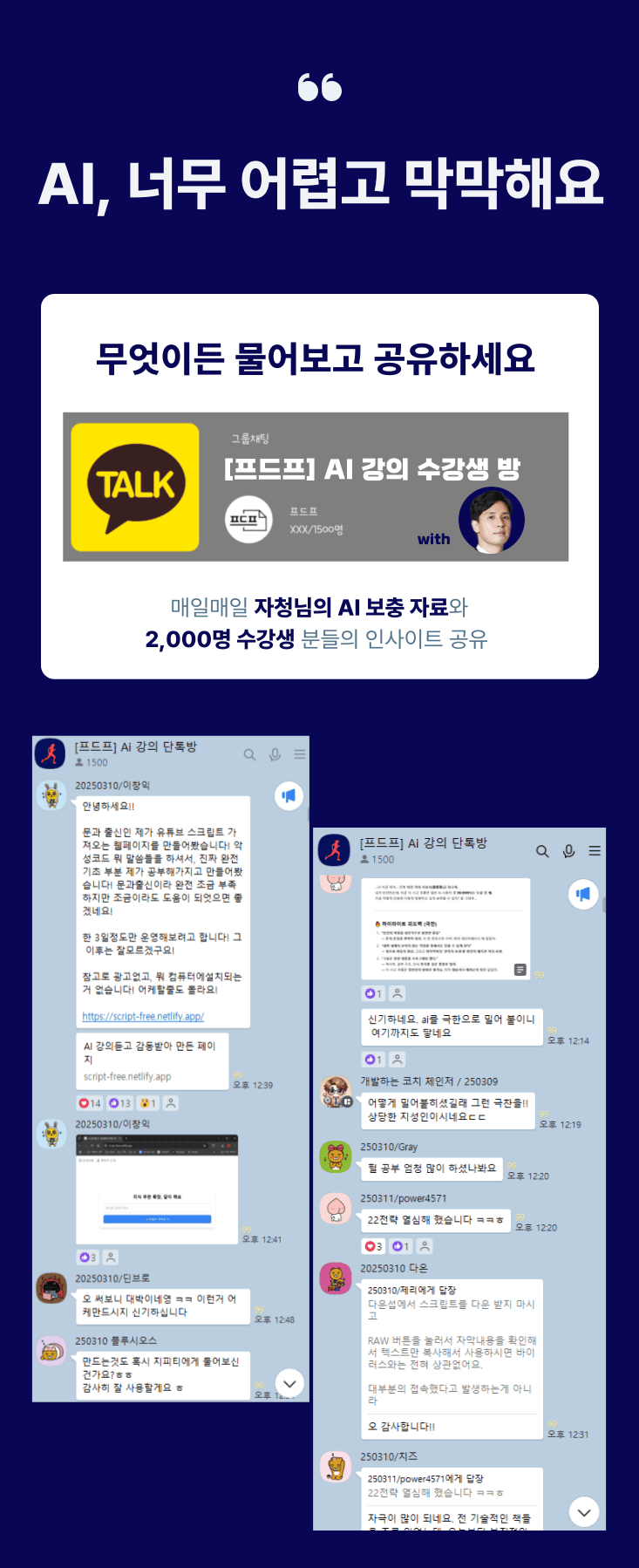 언젠가 부터 AI에 대한 말들이 많아지고 지금 안배우면 어떻게 변할지 모를 미래에 또 후회하게 될까 봐서 결재했는데 결국엔 마지막 날까지 영상을 보고 있네요. 내용이 자세하고 도움이 많이 되는것 같습니다. 자신감도 생기고 희망도 보입니다. 결재한 금액 보다 더 많은걸 얻게 되리란 믿음이 생겼고 ai란 비서가 생겨서 감사합니다. 삶에 많은 보탬이 되어 발전하는 제 모습을 보게 될거란 생각에 기쁘네요. 자청님 늘 감사합니다.