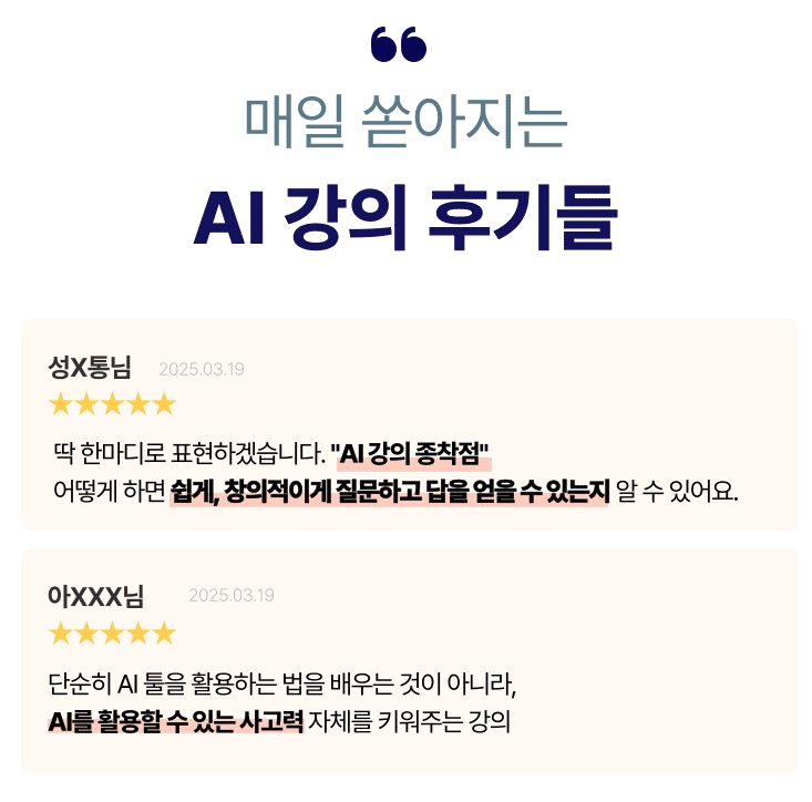 강의를 듣고 저의 AI 활용 능력이 '갓난아기' 수준에서 '유치원생' 수준으로 발전했습니다. 단순히 질문만 하던 이전과는 비교할 수 없을 정도...더보기