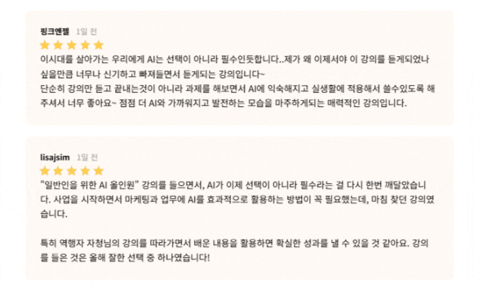 몇몇 AI강의를 들어봤지만, 근본적인 부분부터 배울 수 있어 앞으로 어떤 AI가 나와도 적응할 수 있게 점이 가장 좋았습니다. 문해력과 독서가 앞으로 AI 시대에 더 중요하단 생...더보기